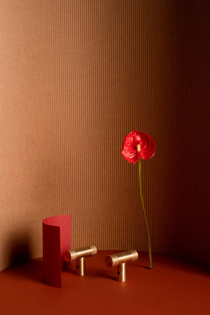 T-bar made of solid brass. Feature cross-knurl pattern and are refined by hand.