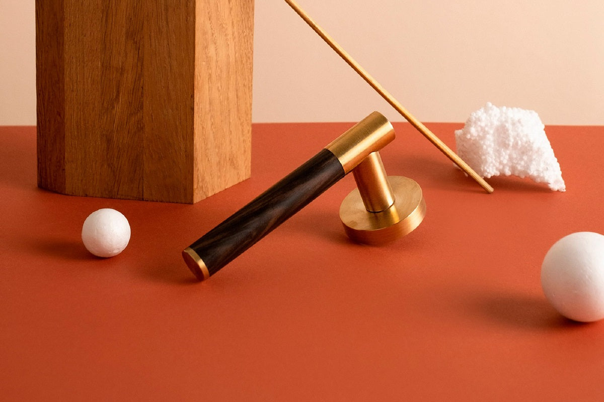 The natural wood contrasts brilliantly with the industrial solid brass, perfect for interiors seeking a clean, modern look with a touch of sophistication.